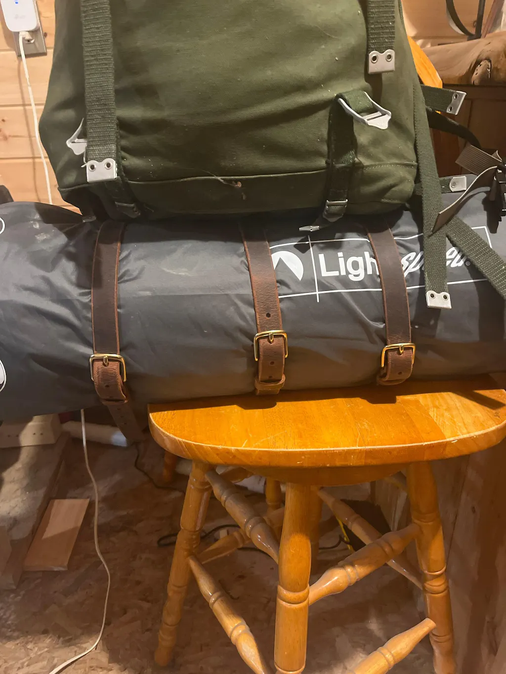 Person holding a green roll-up rug with leather straps in a forest setting