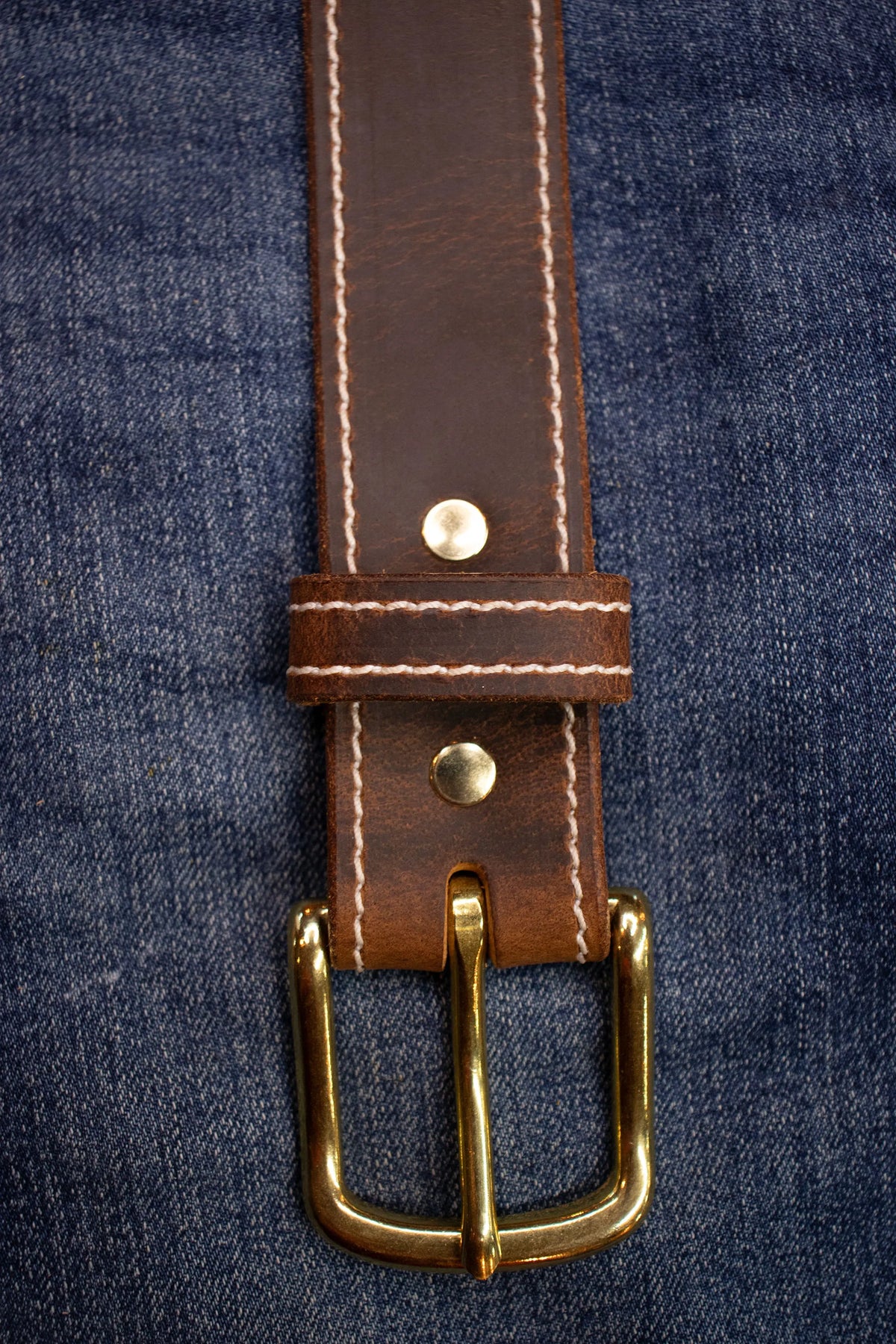 Brown leather belt with brass buckle on a denim background with nice white stitching on belt